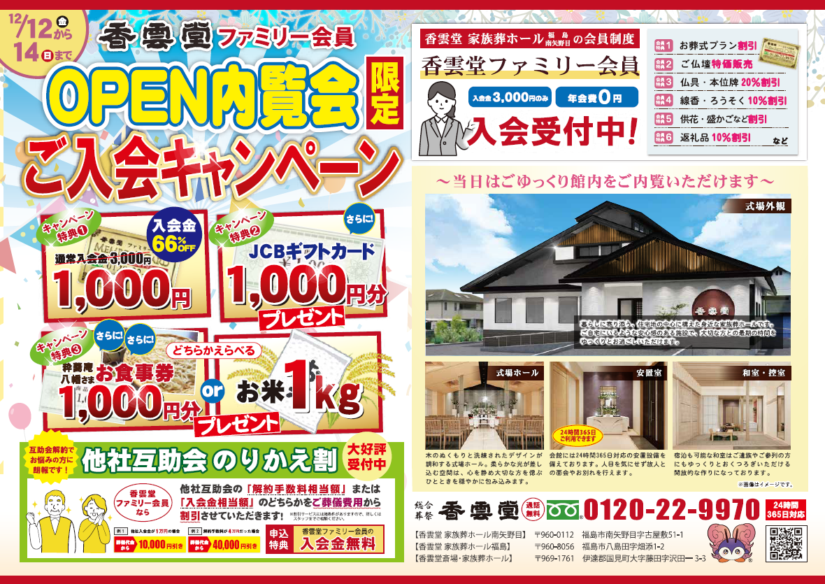 香雲堂 家族葬ホール南矢野目 OPEN 特別内覧会 12/12(金)〜14(日)開催!
