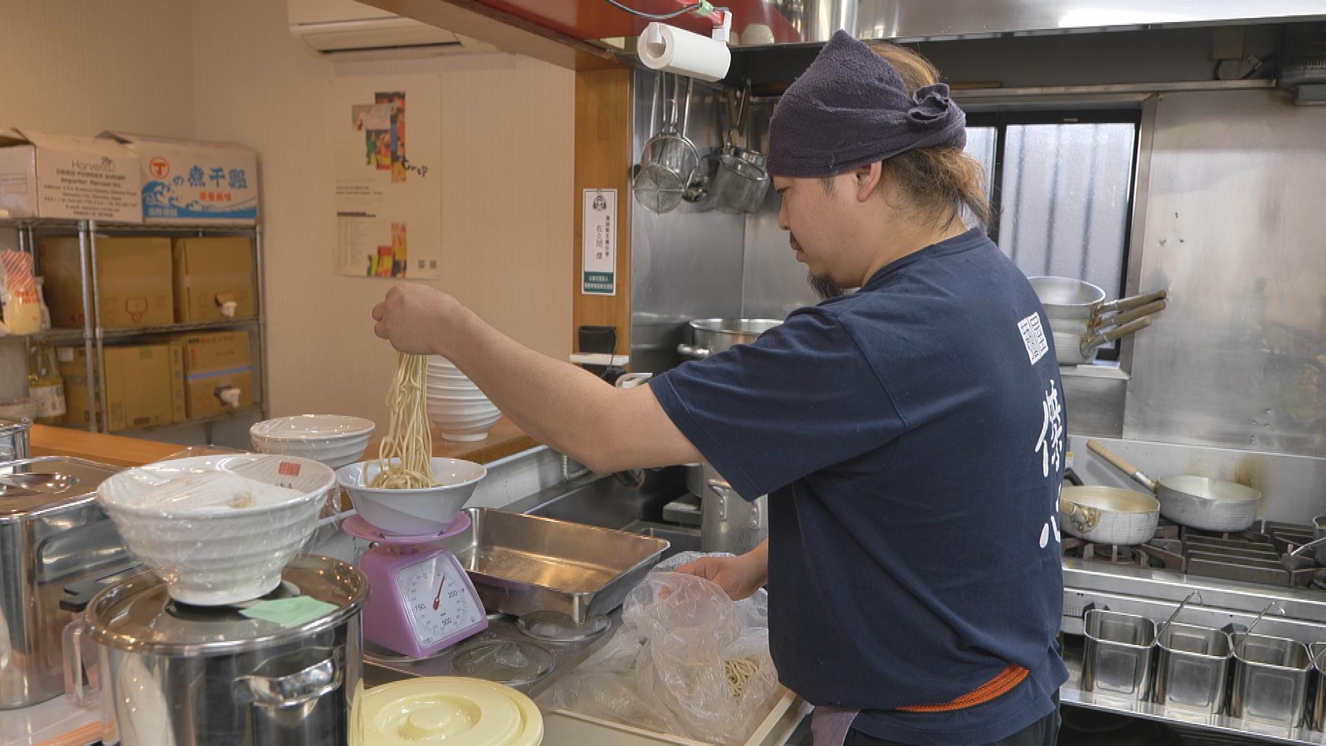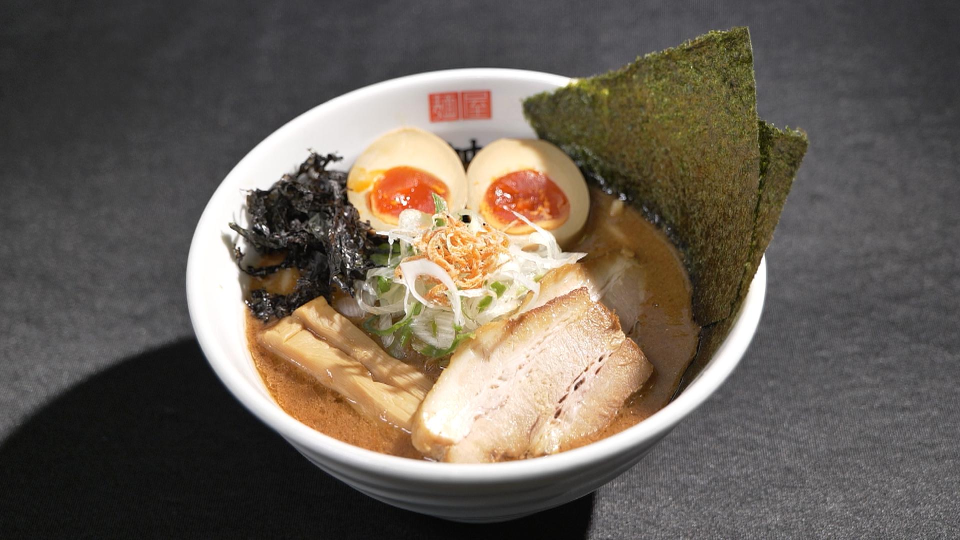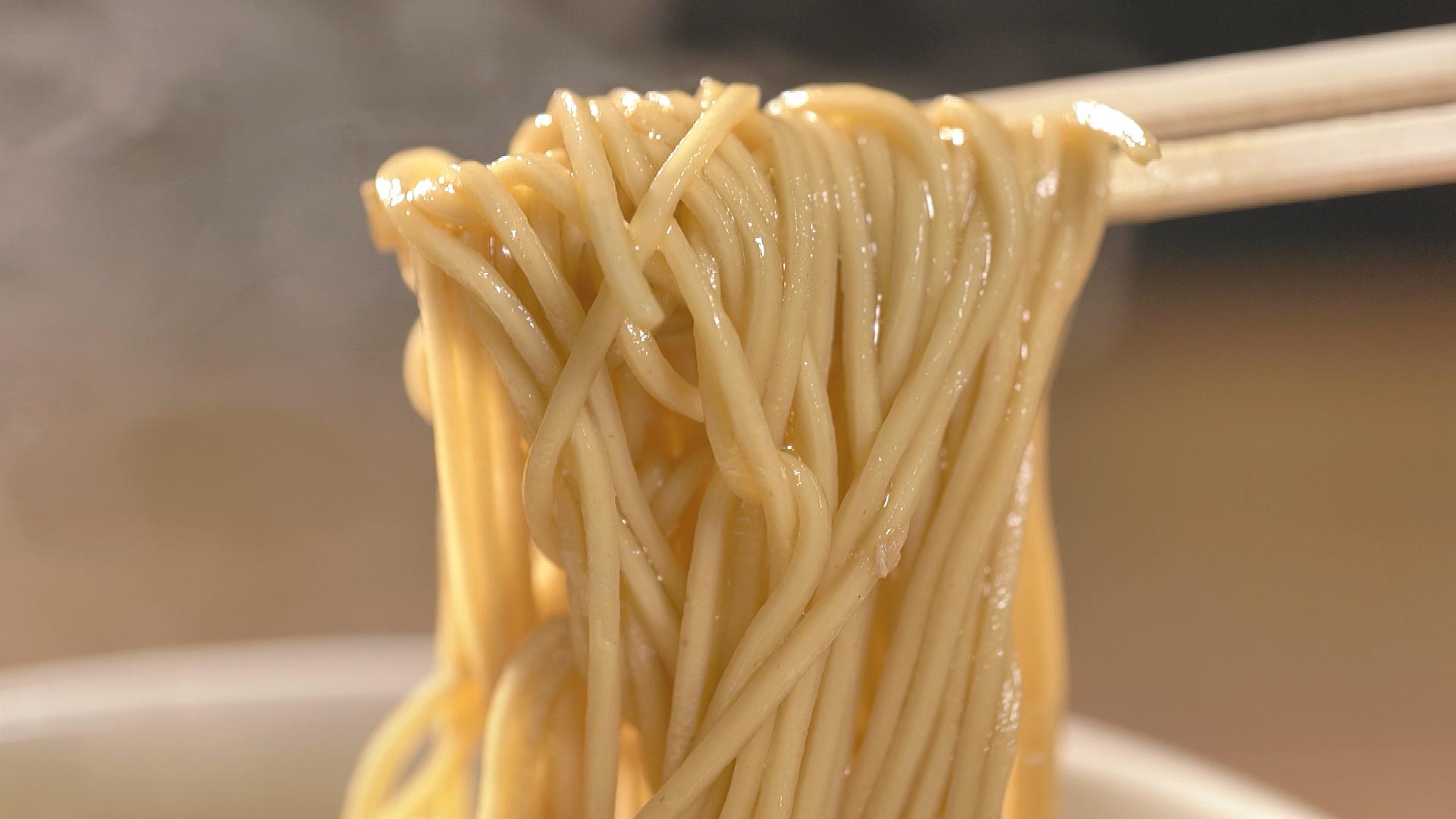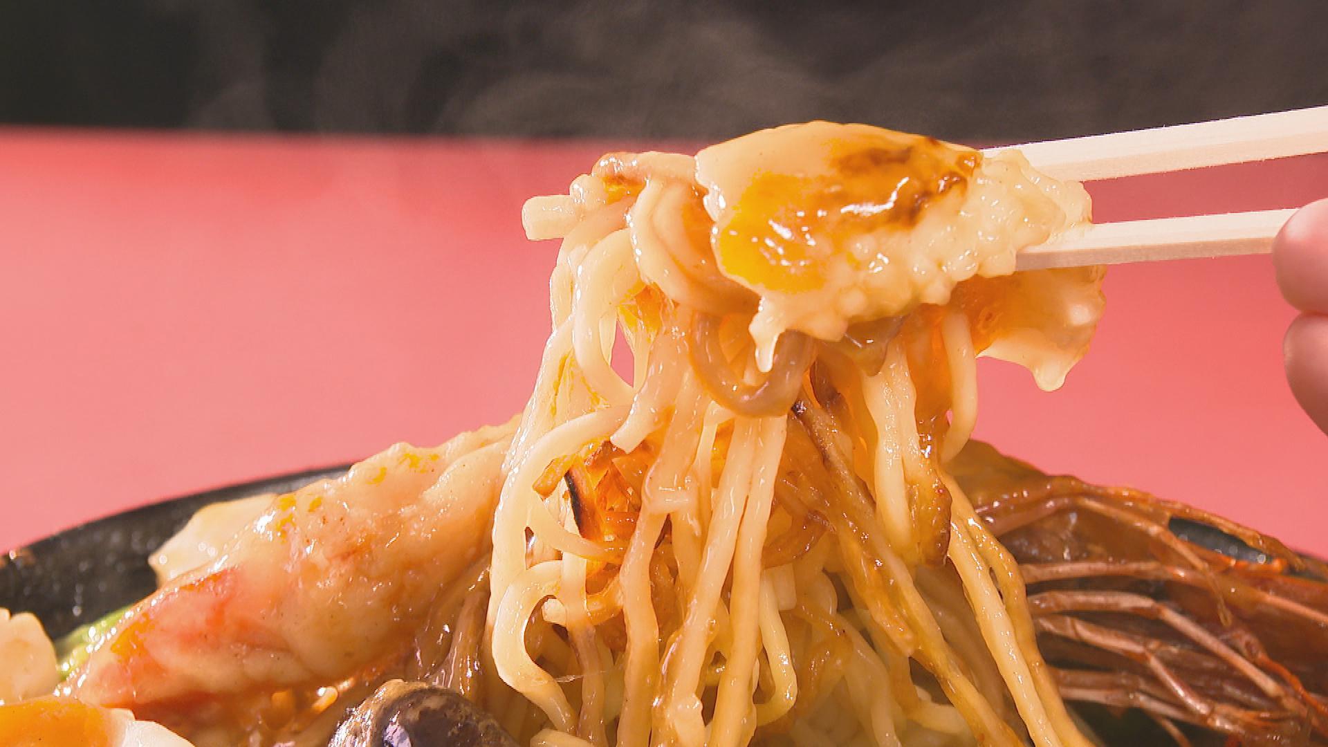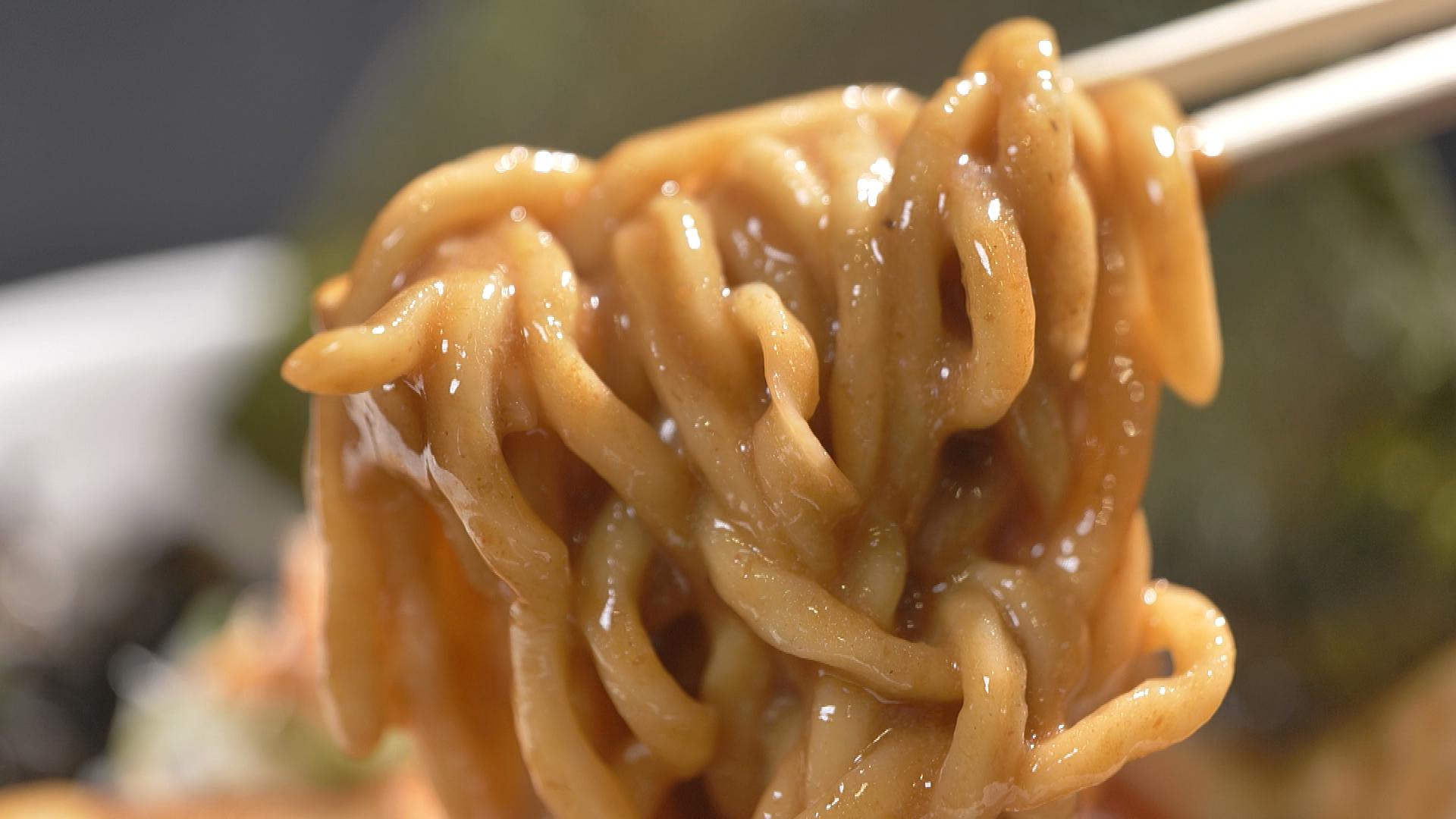 スープに負けない麺を目指した自家製麺。こだわったエビ粉とエビ油を使用。9時間煮込んだ豚骨魚介スープと絡めたら完成!