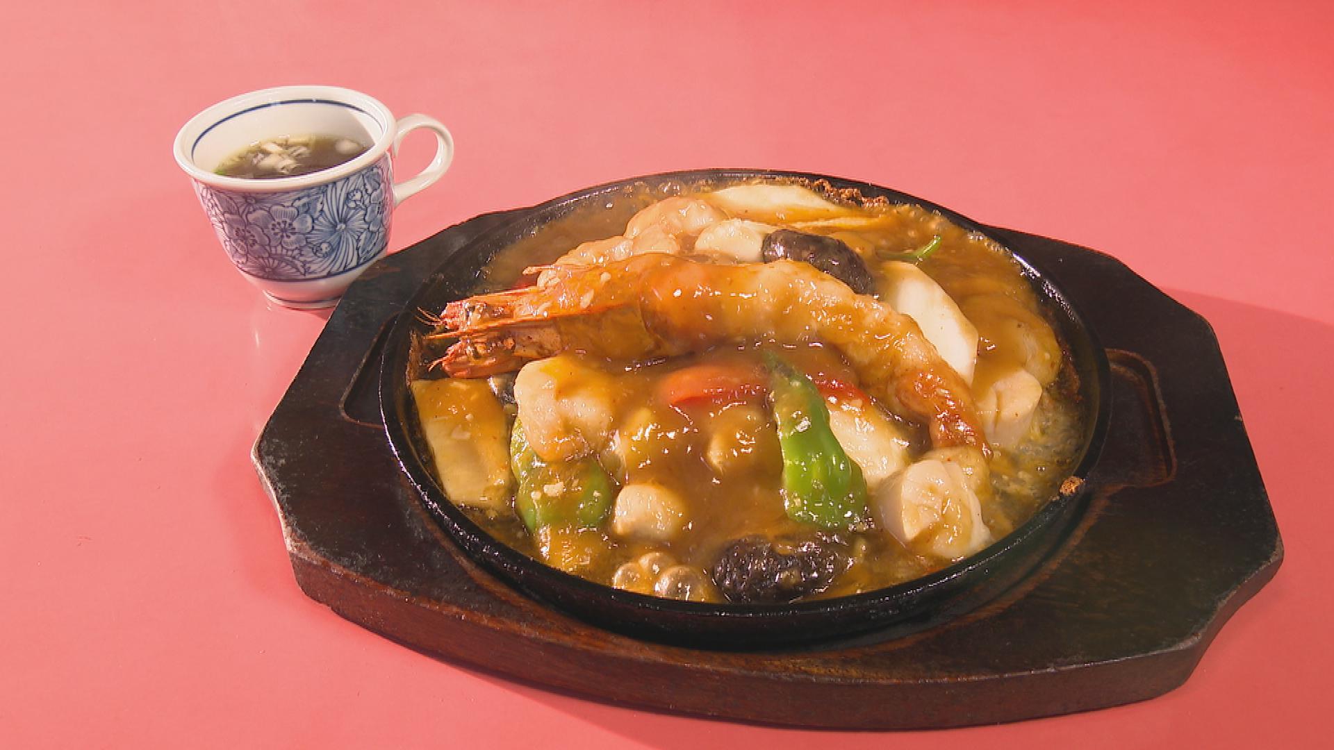 鉄板で焼き上げた麺の上に、豆板醤やしょうゆなどで味付けした餡がたっぷり。さらに餡の上には大きなブラックタイガーが丸々1尾のせて出来上がり。