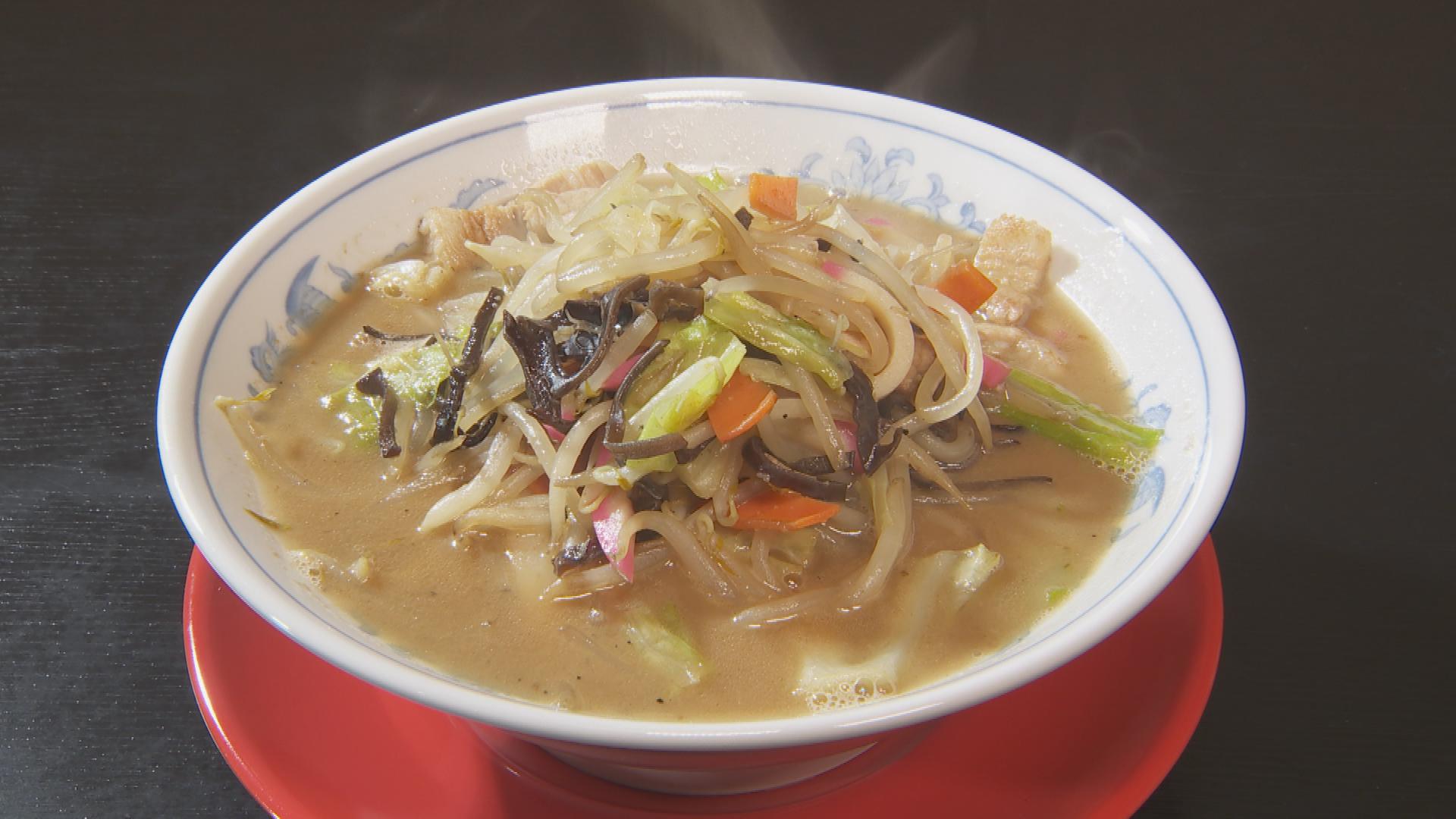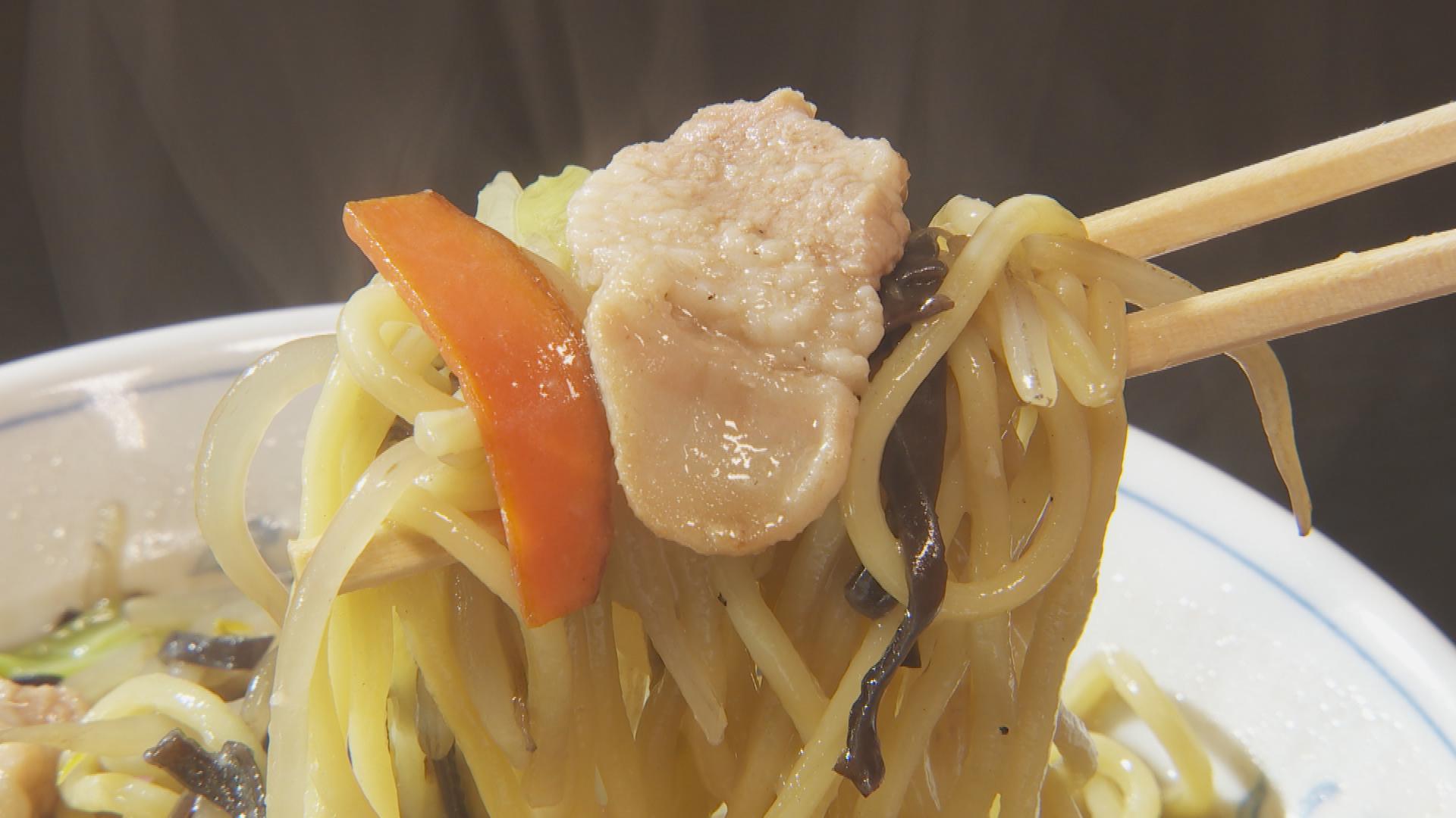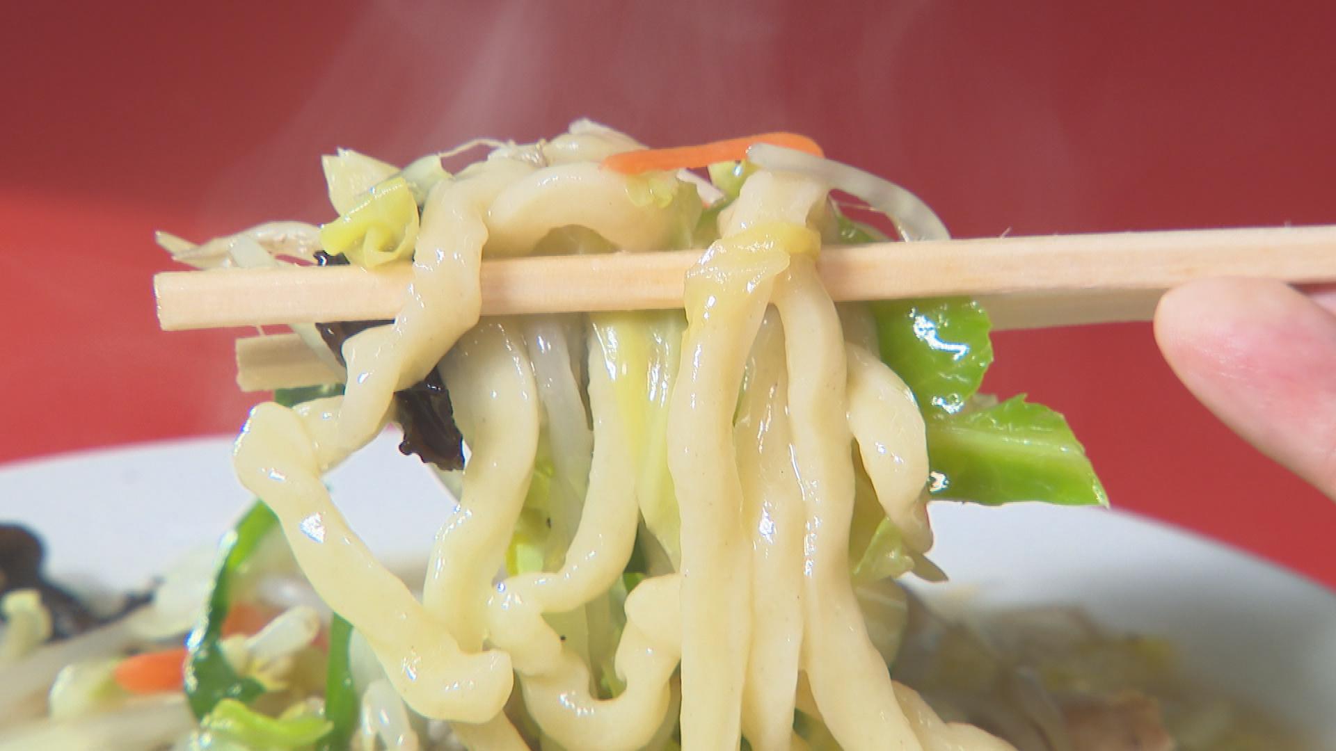 麺はタンメン用に製麺した太い麺を使用。豚骨と鶏ガラでとったスープで野菜を煮込みます。