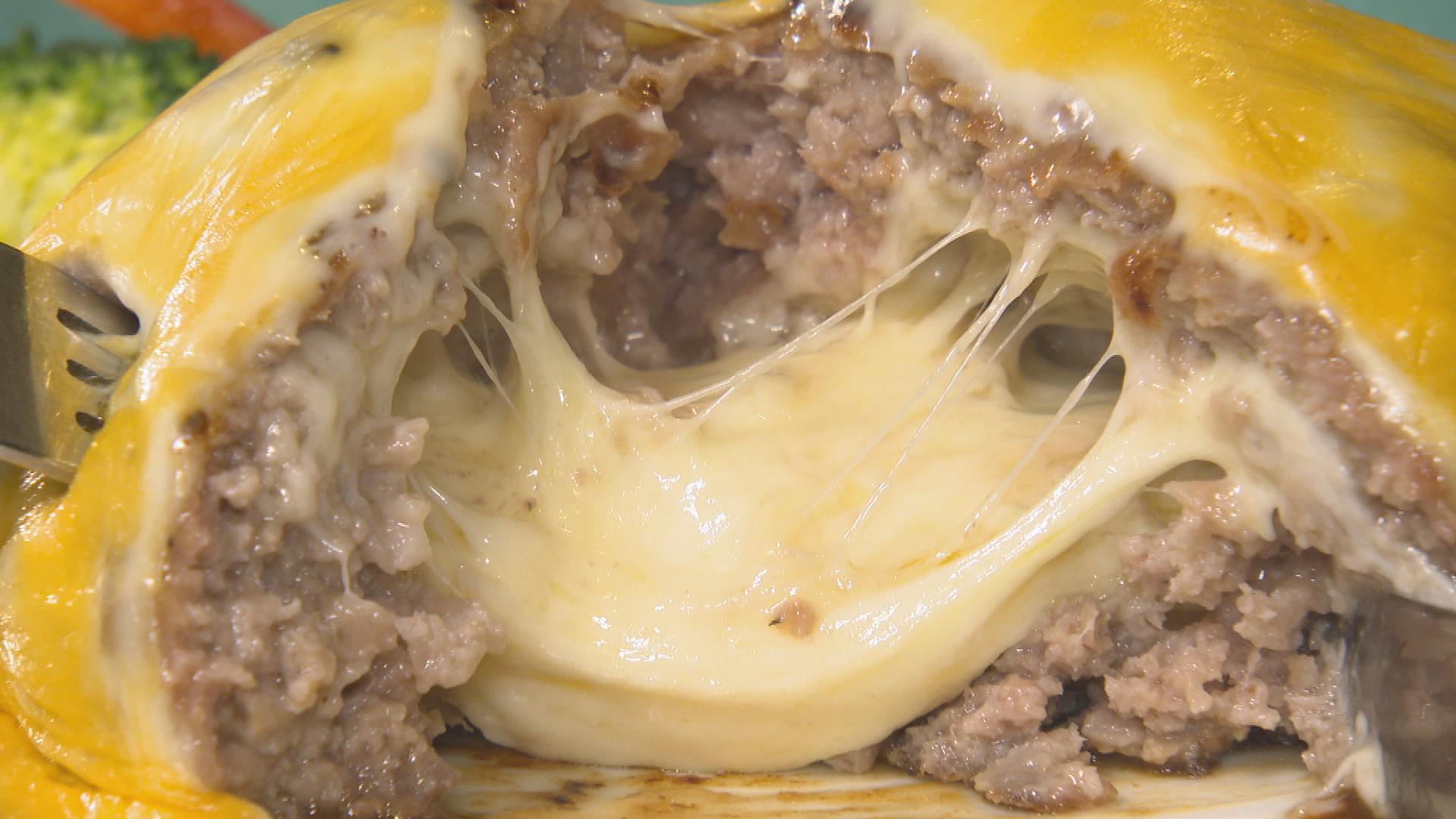 たっぷりのチーズをあらびき肉で包み、オーブンでじっくりと火を通す。さらに、ハンバーグの上にチーズをのせてもう一度オーブンへ入れたら完成!