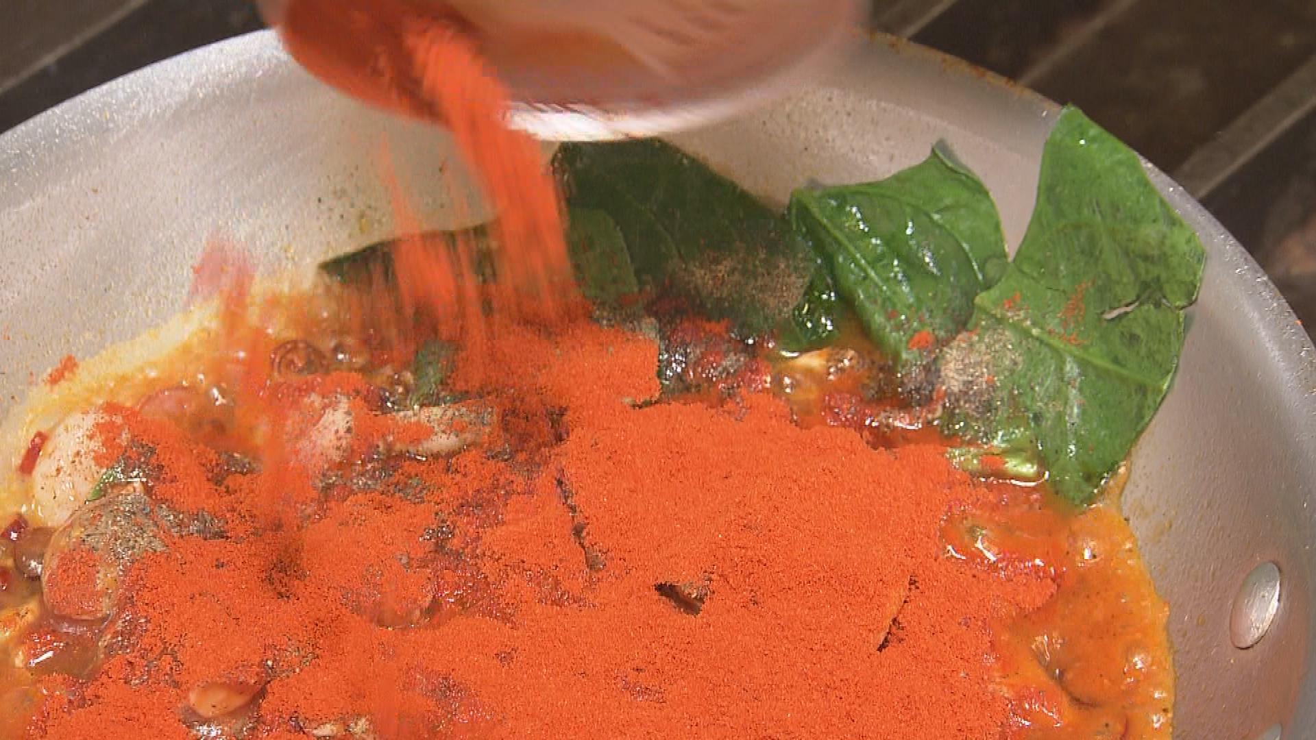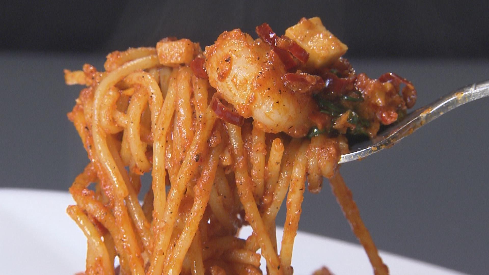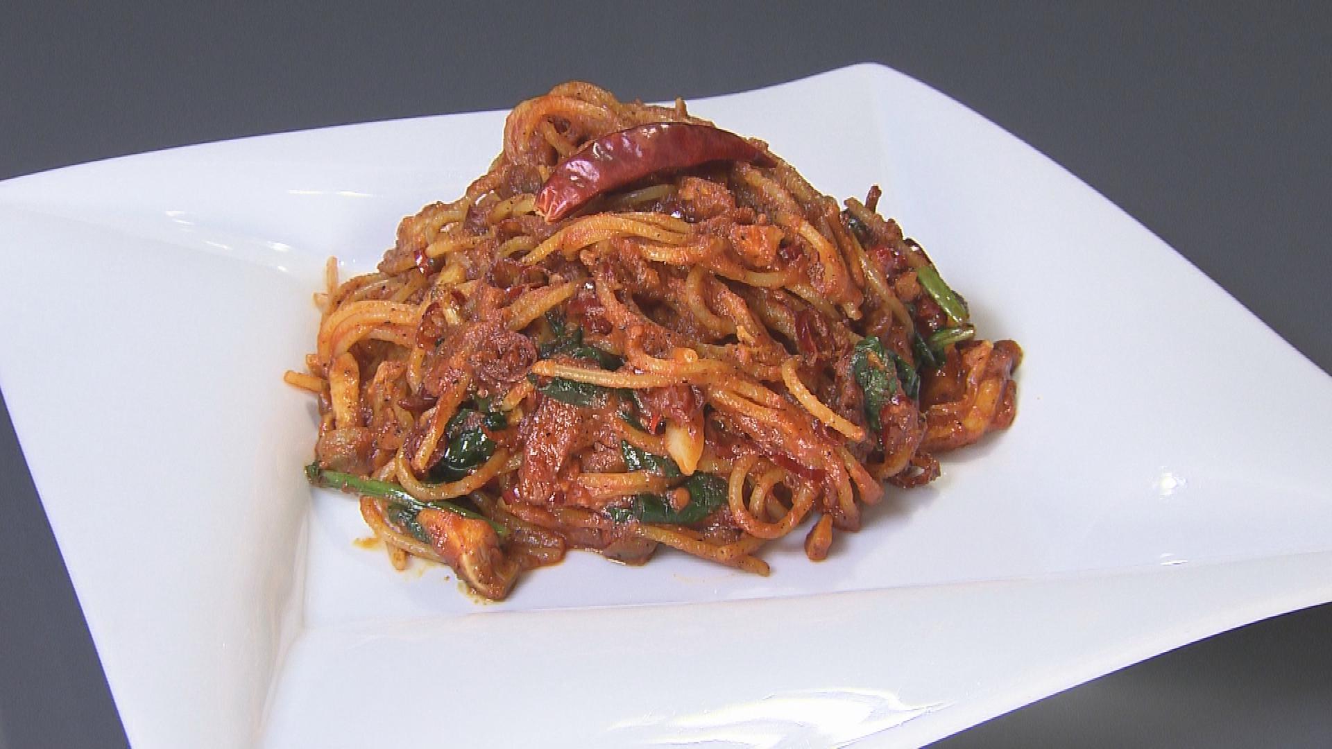 自家製の唐辛子オイルに唐辛子とニンニクを合わせ、激辛カイエンペッパーを入れる。パスタと絡めて完成!